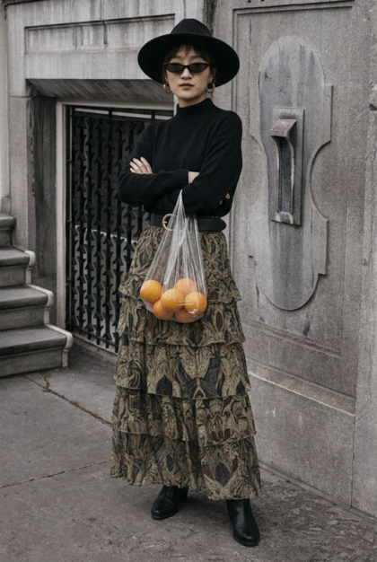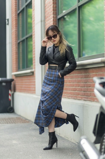 格紋不規則抓褶長裙