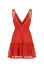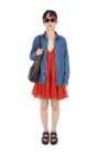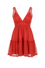 設計細節:V 領剪裁、高腰鬆緊束口、兩層式層次裙襬 (Tiered Skirt)。