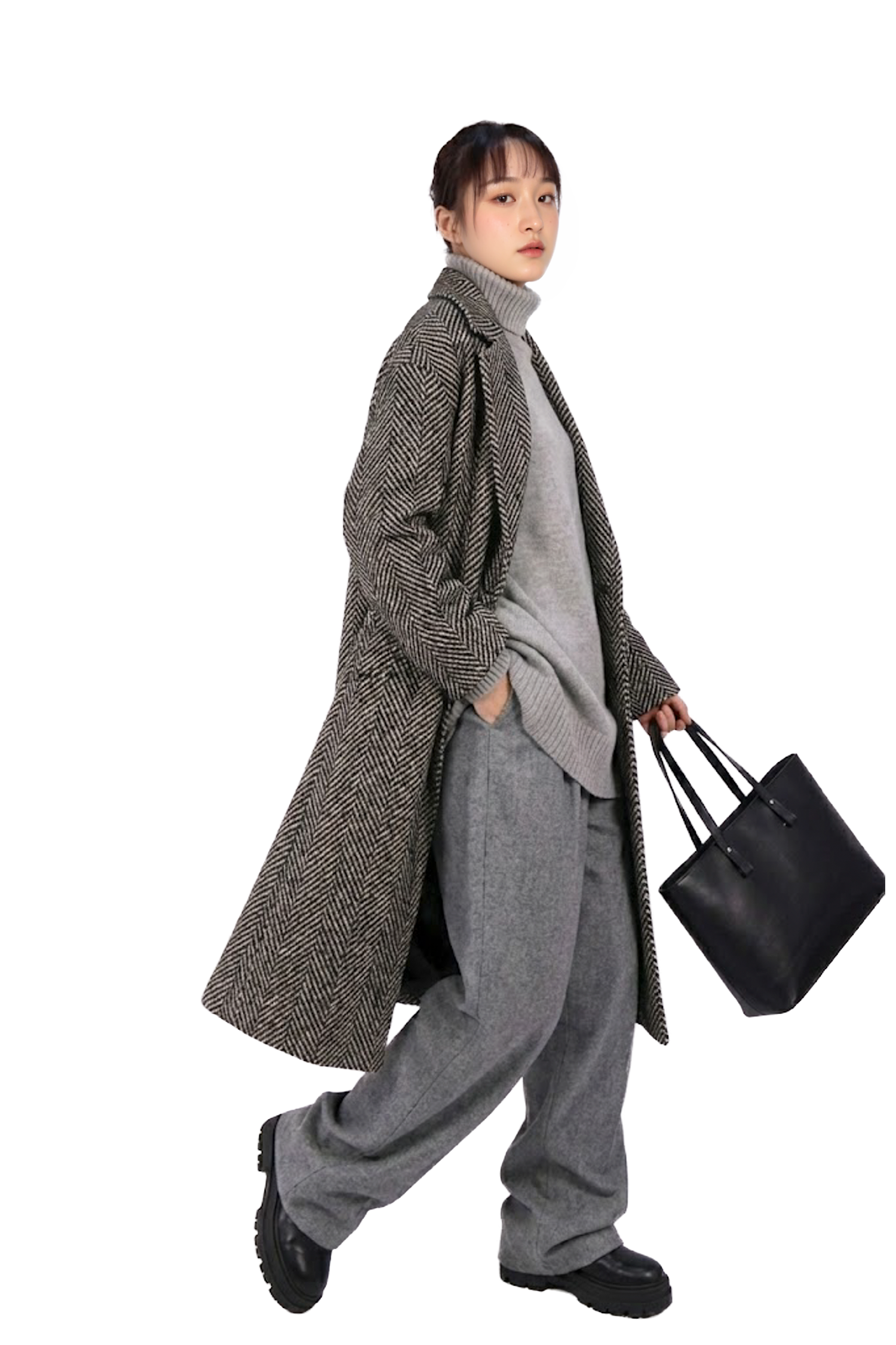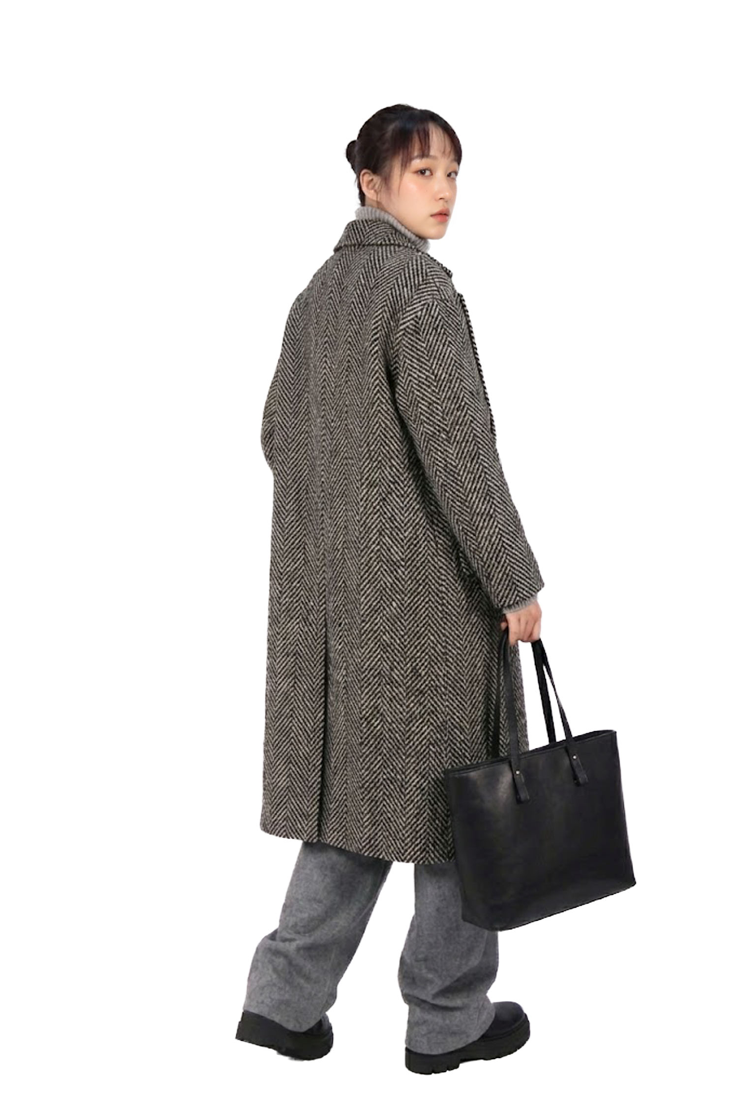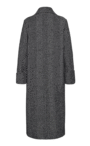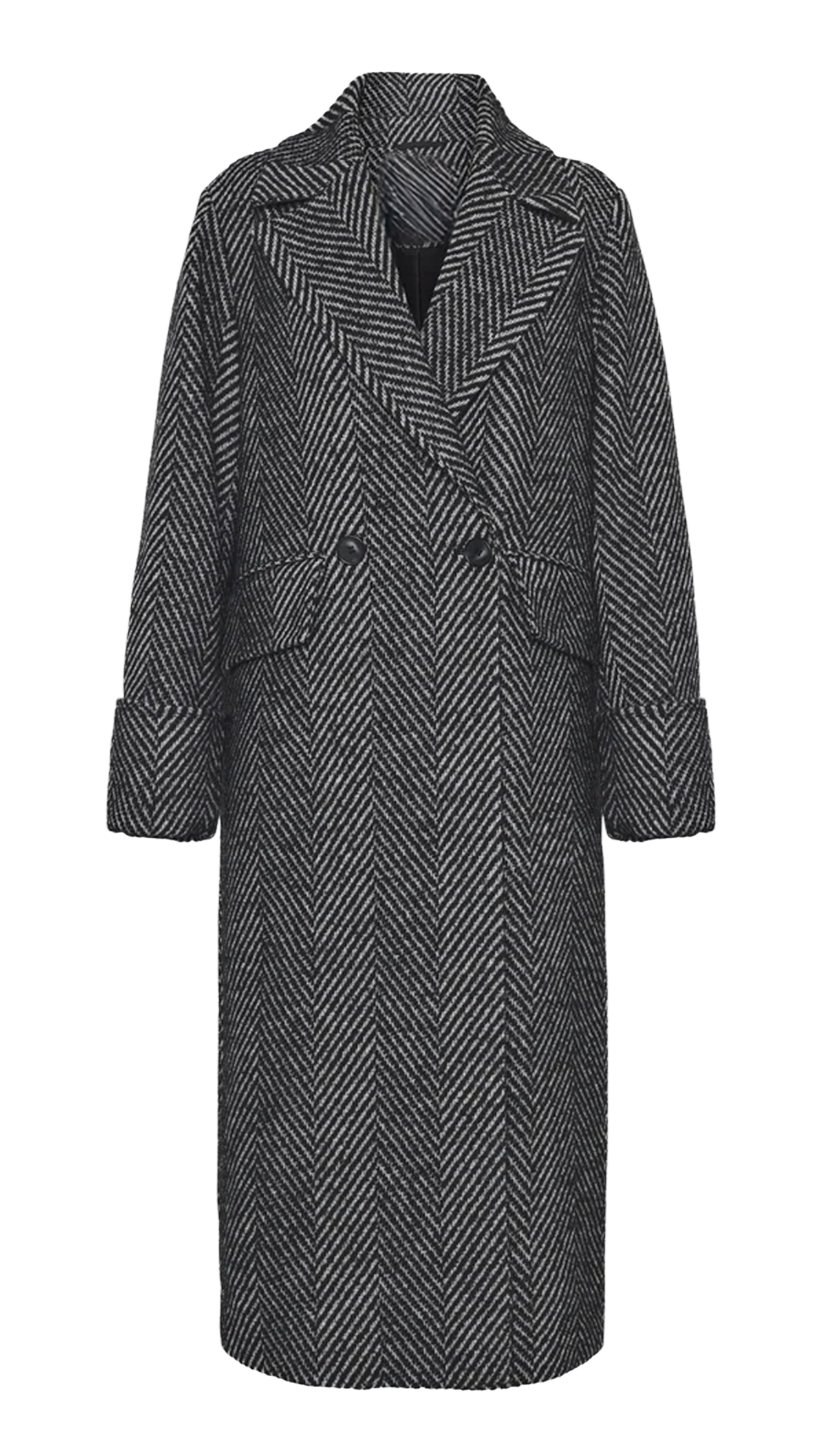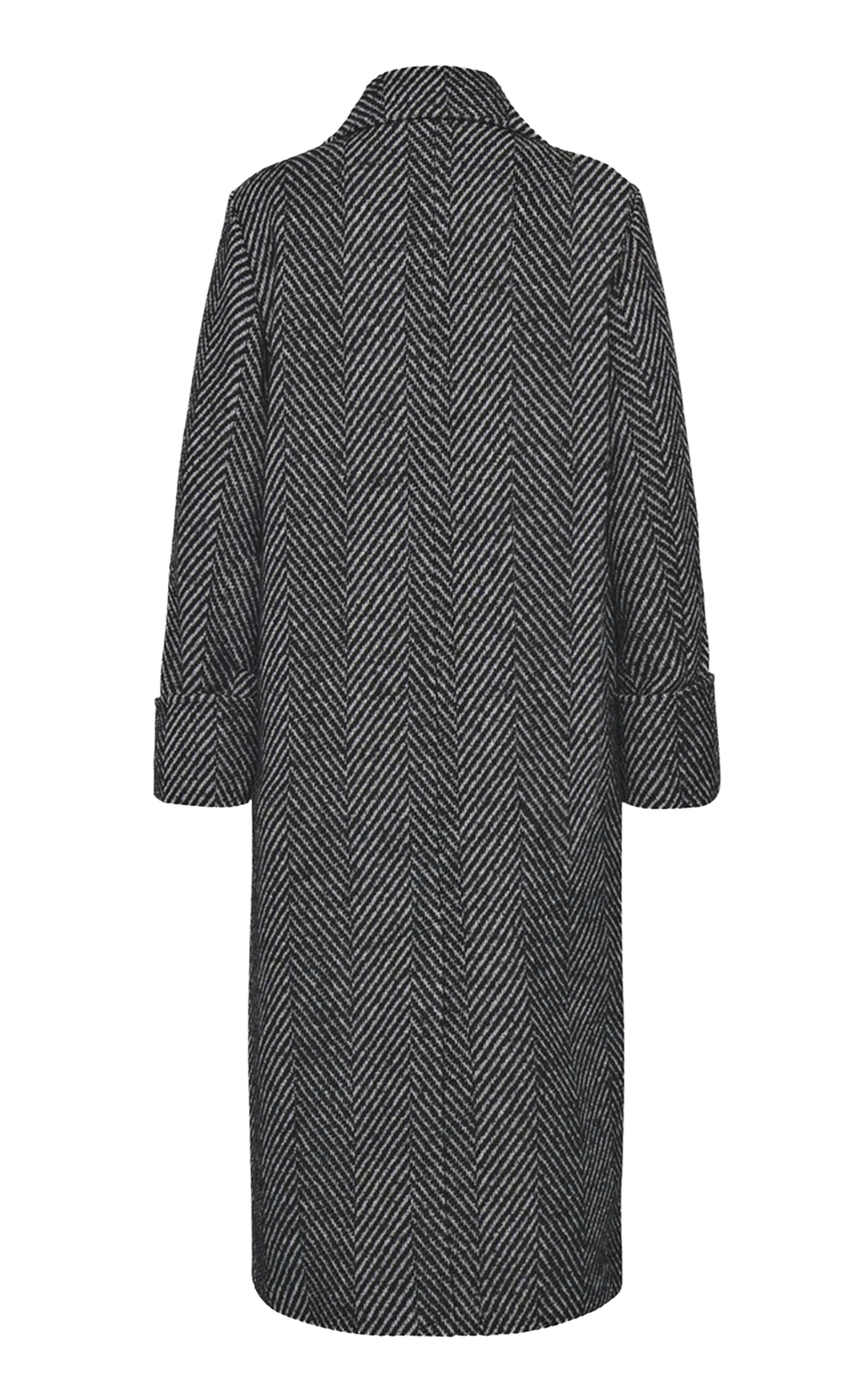 寬鬆版大衣;標準翻領;長袖配鈕扣;嵌線前口袋;雙排鈕扣閉合;後開叉。