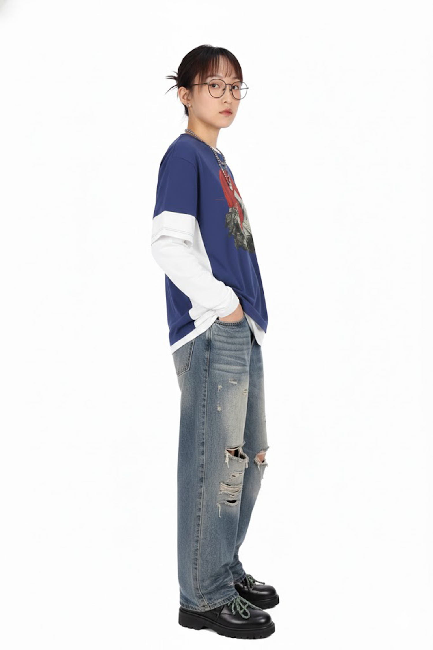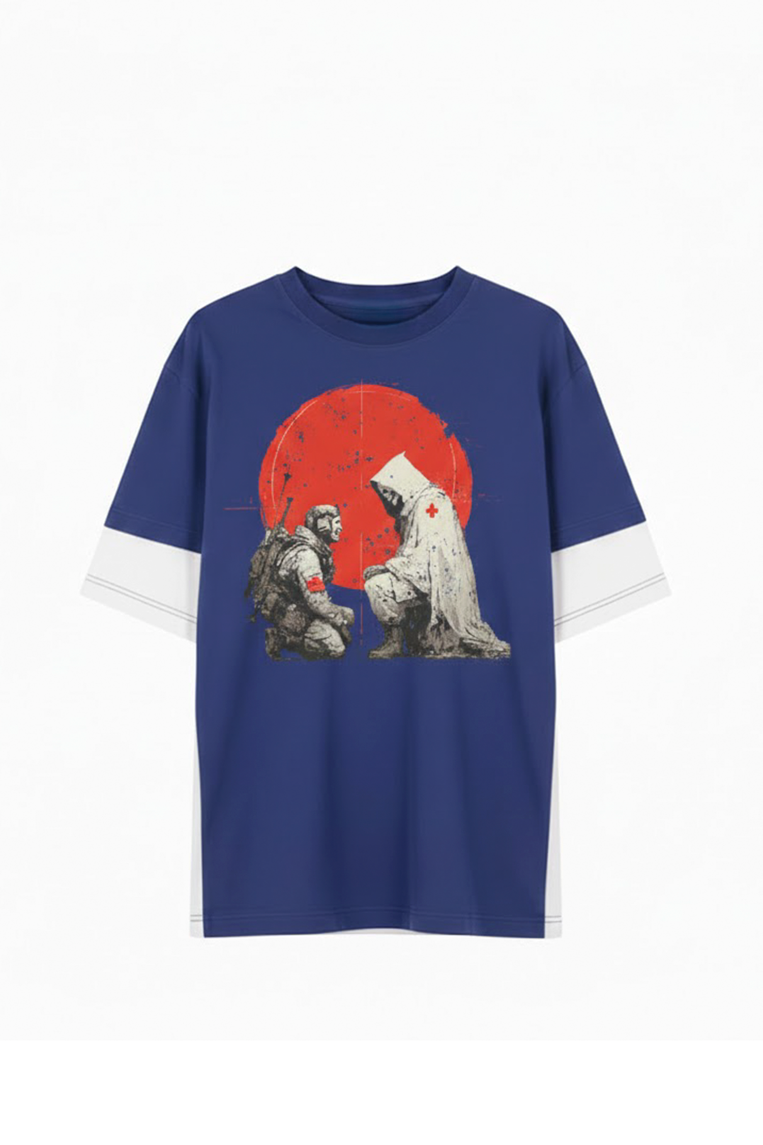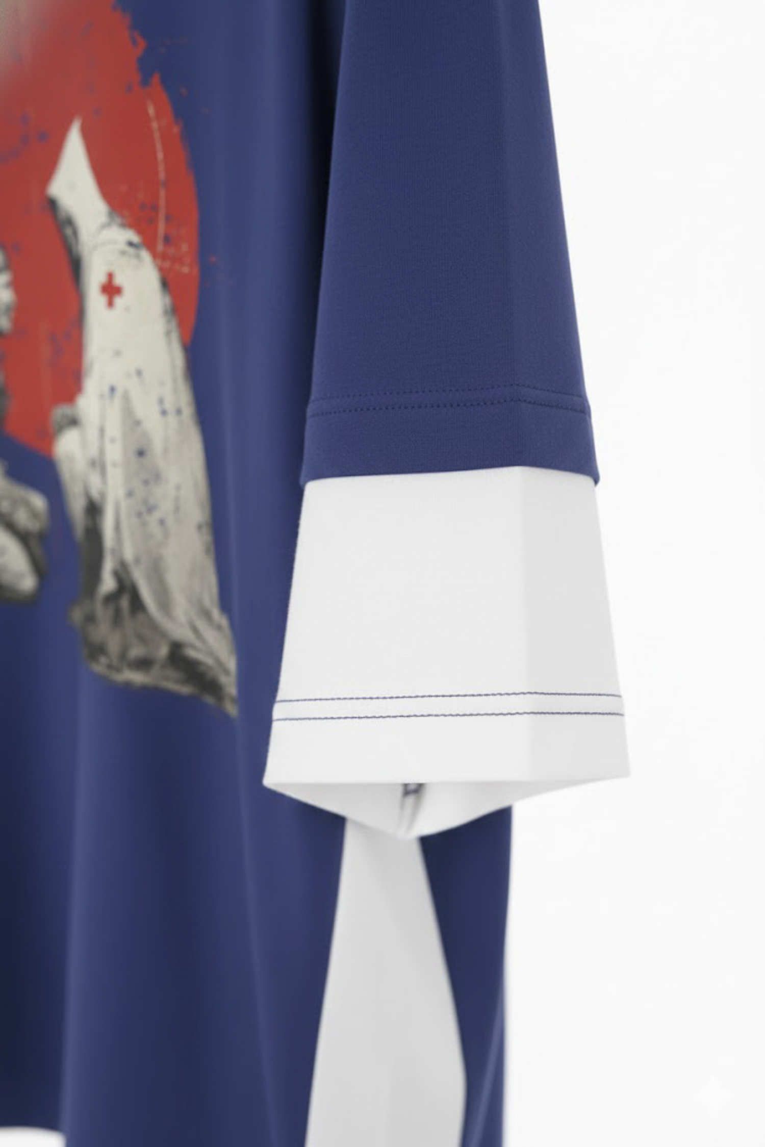設計細節:假兩件拼接袖、高精度數位膠印圖案(細節處帶有斑駁風效果)。