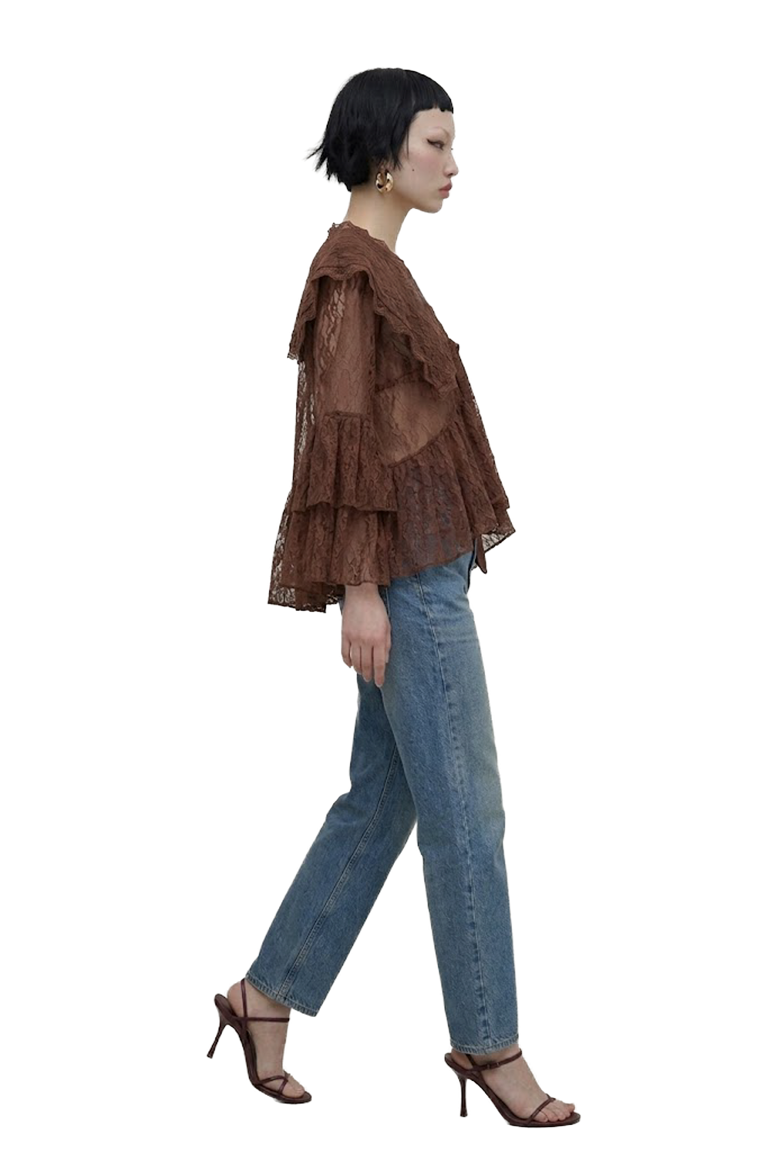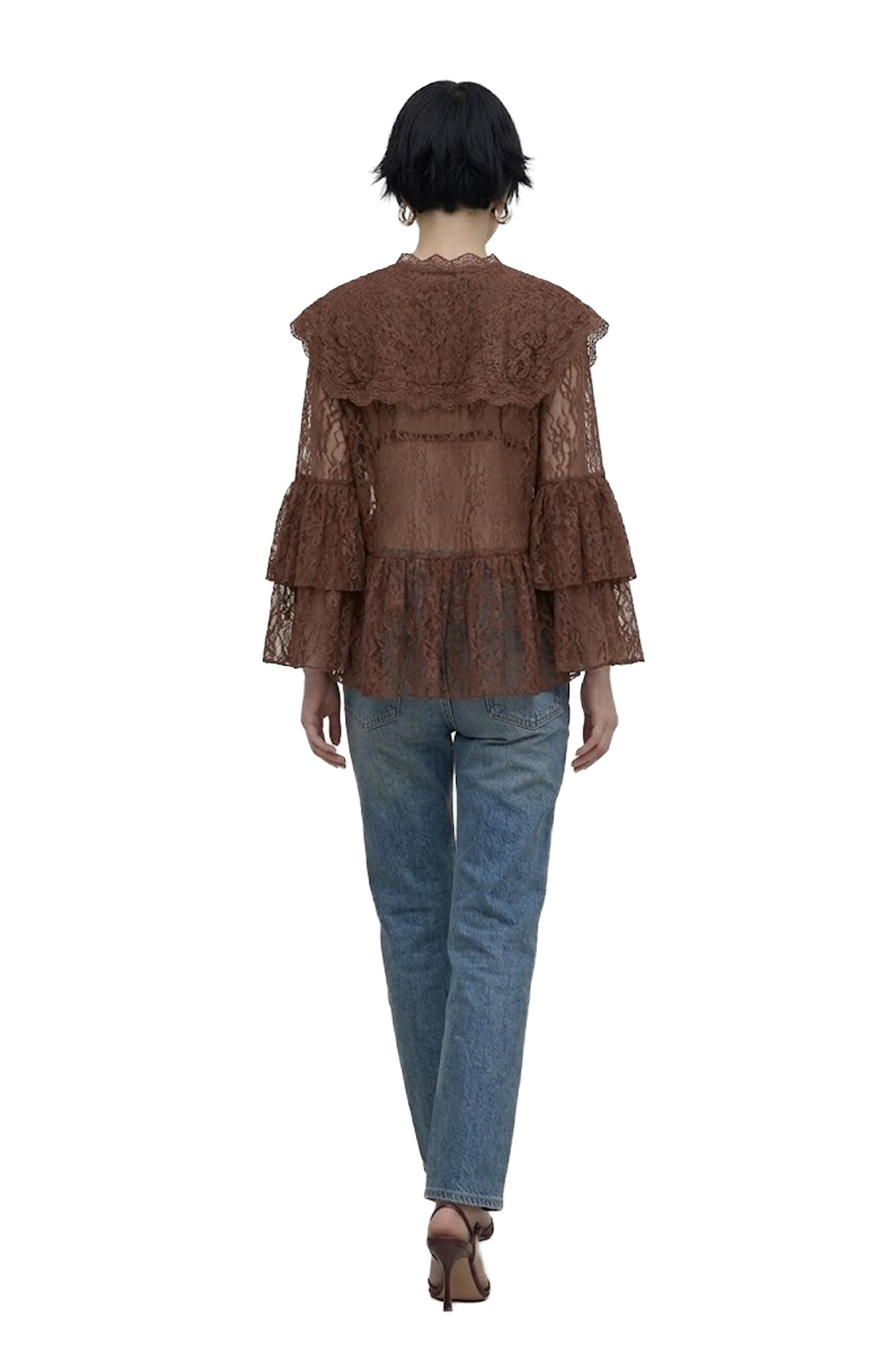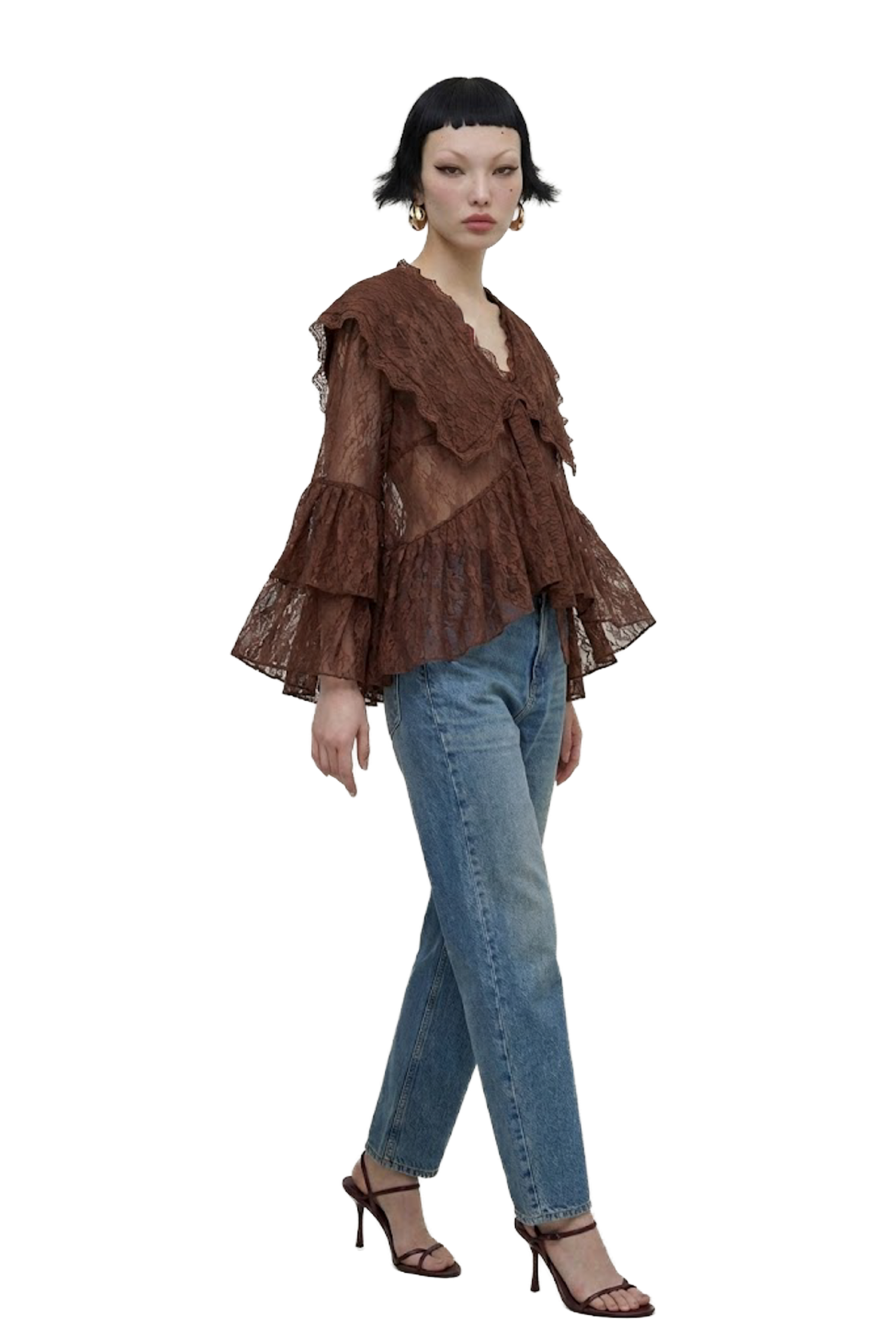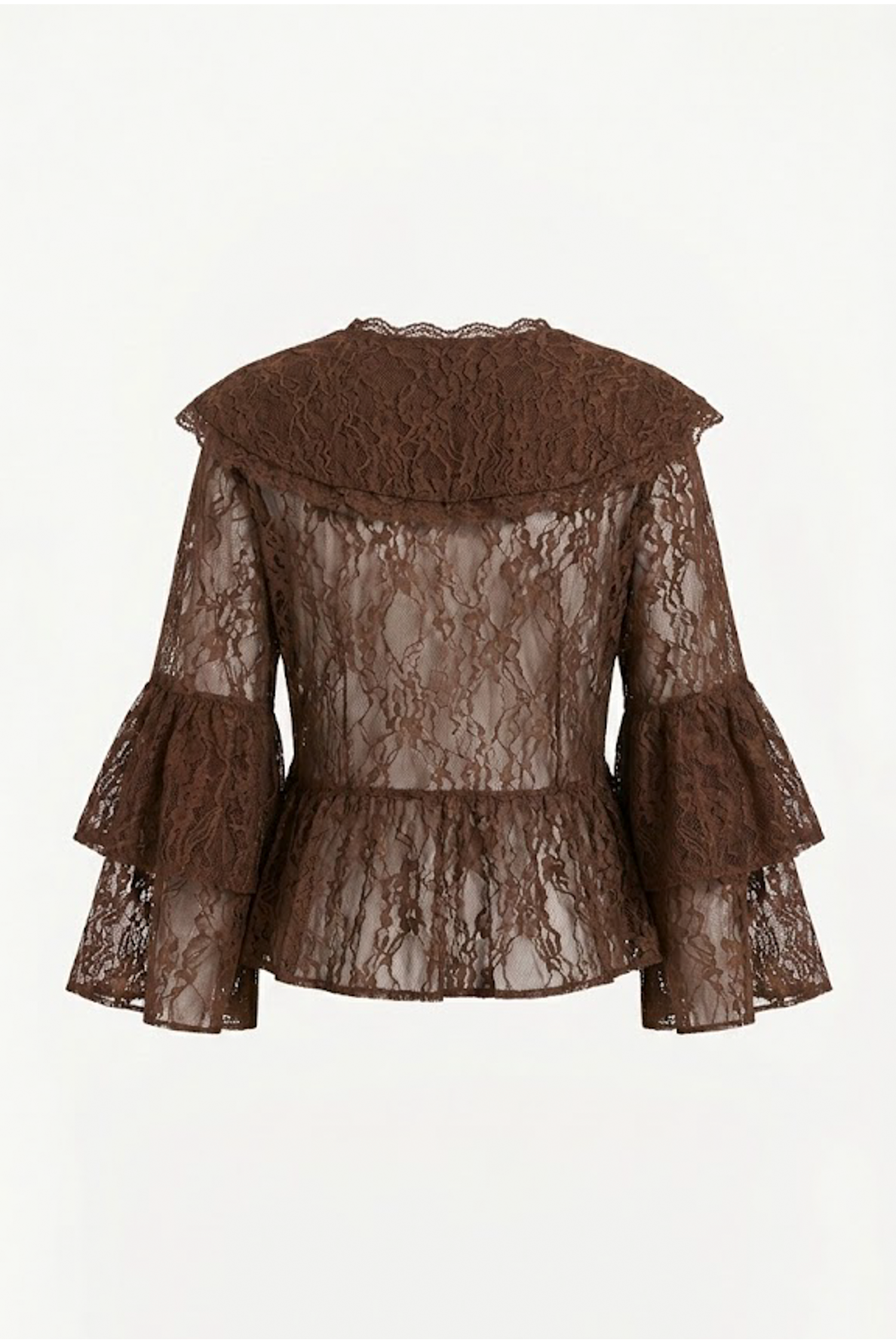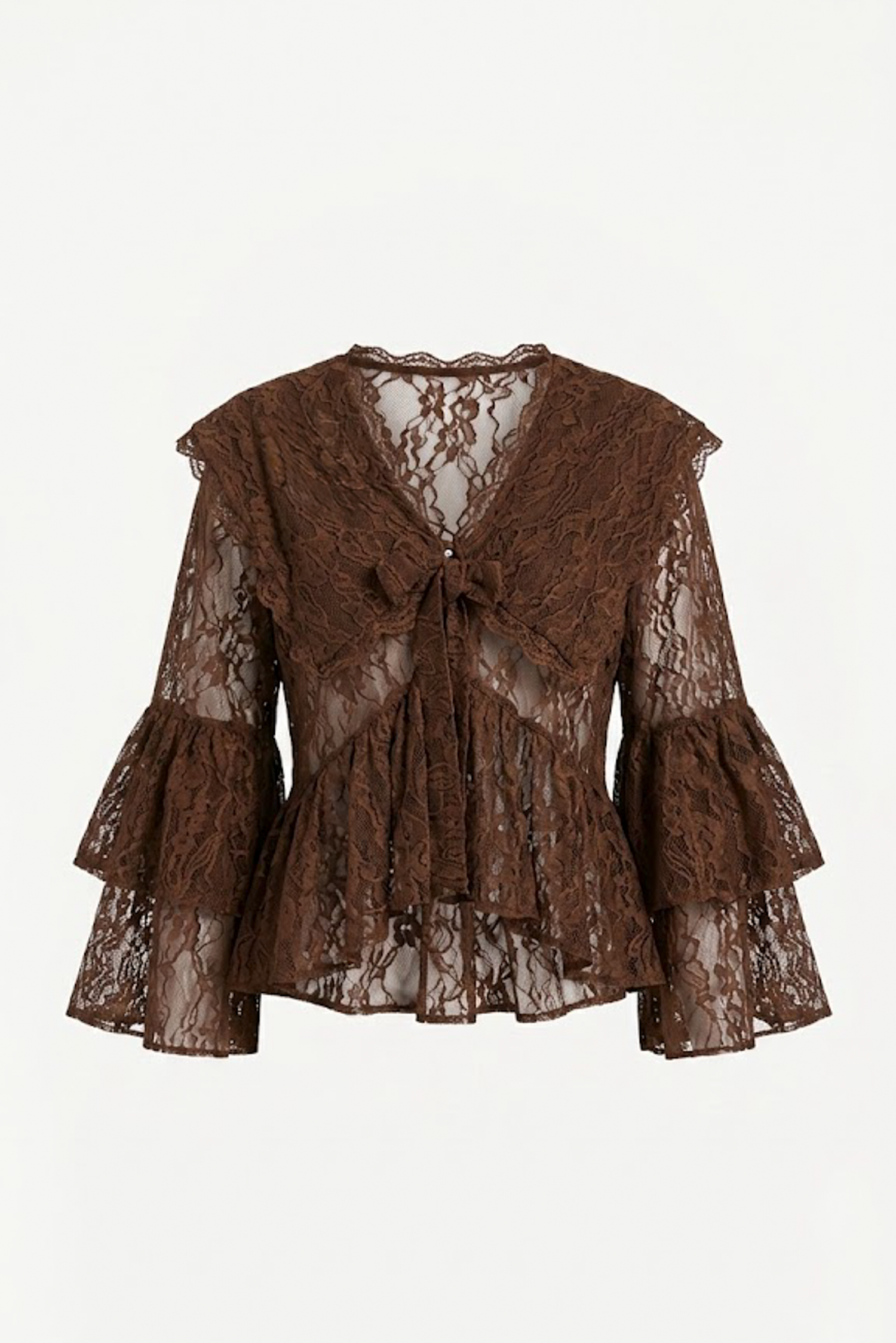 精緻鏤空蕾絲: 全衫採用細膩的花卉蕾絲織紋,呈現優雅的半透視感與層次豐富的視覺深度。