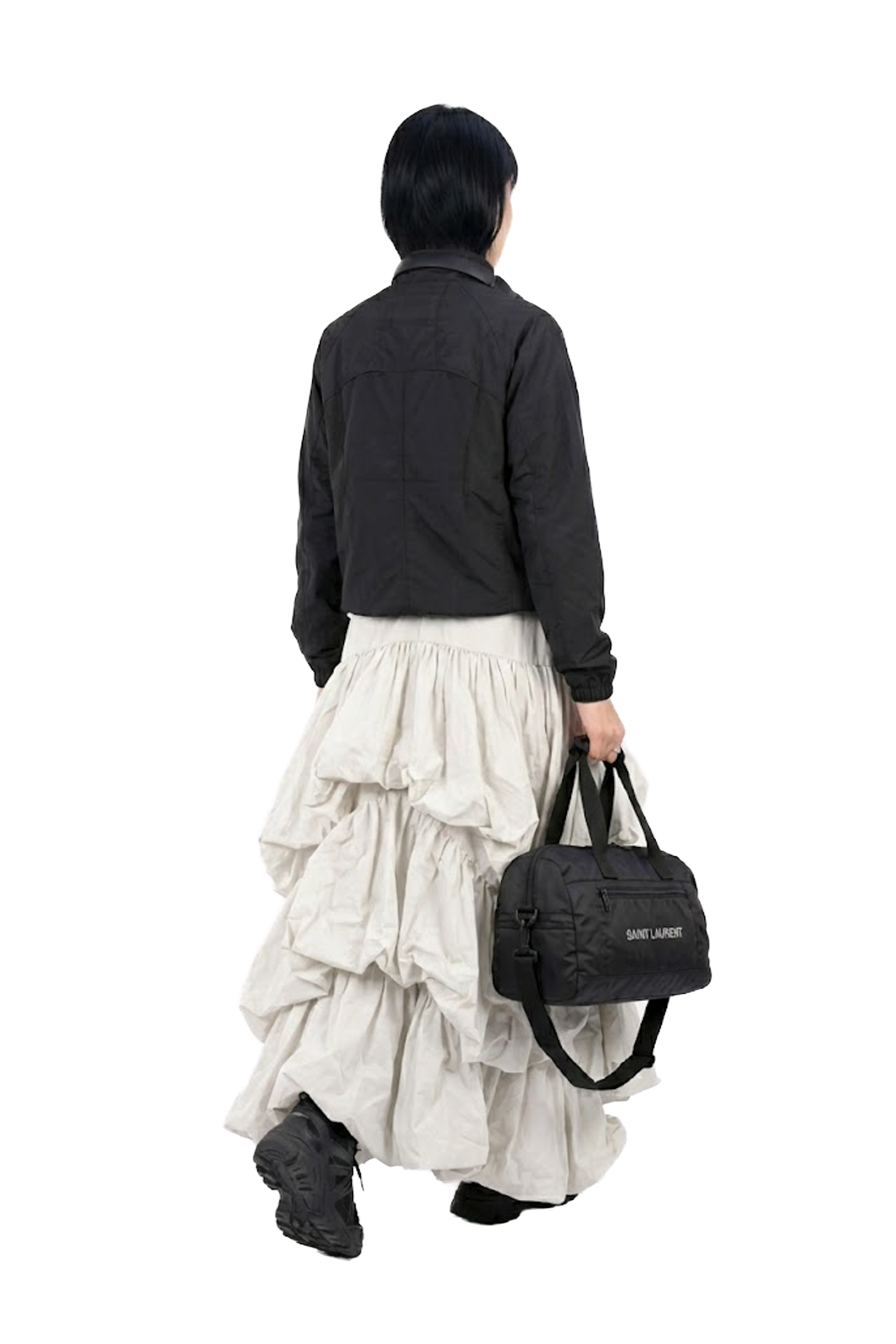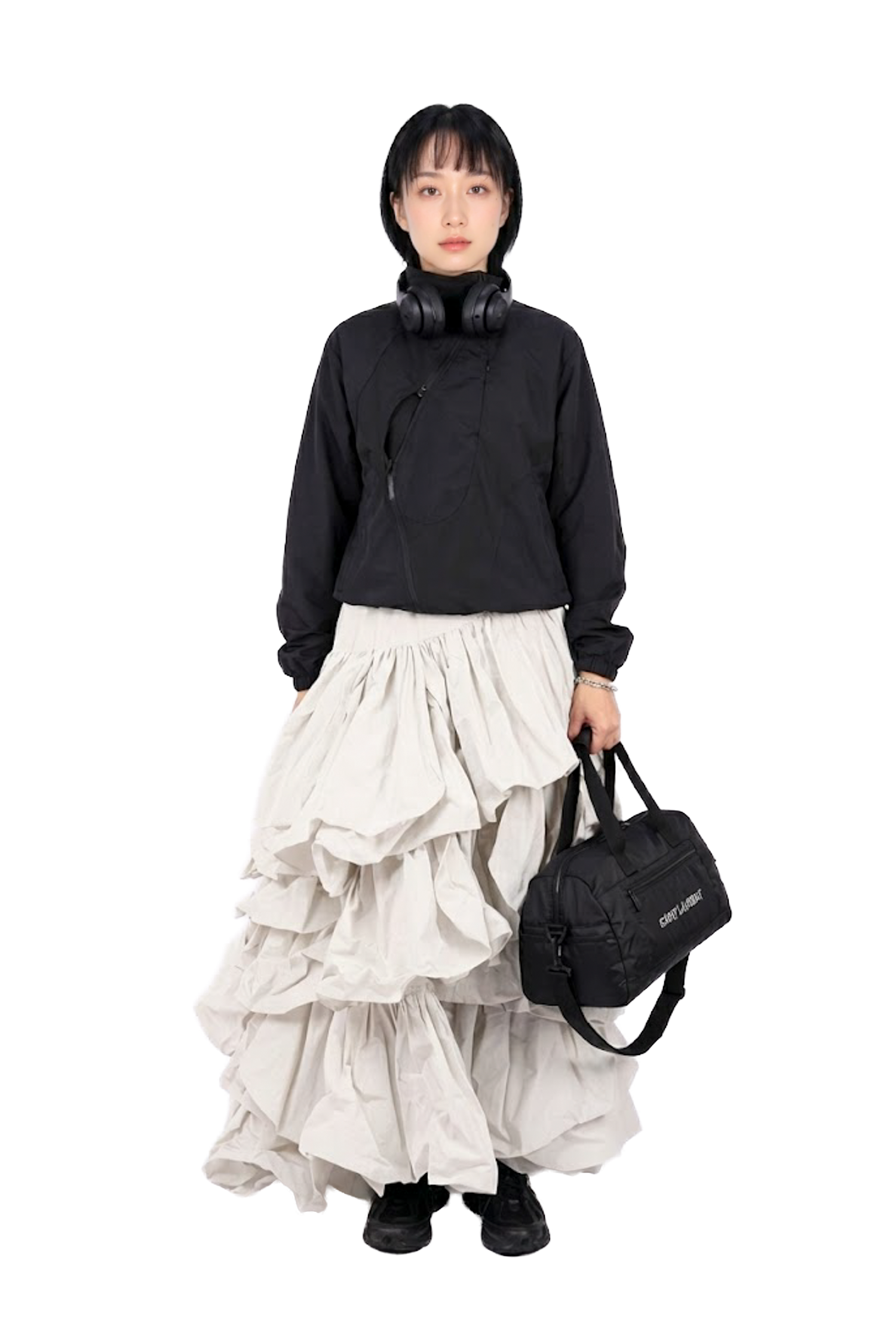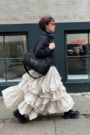 多層次荷葉解構 (Tiered Ruffles):不對稱的荷葉邊交錯重疊,形成如雲朵般豐富的視覺體積。