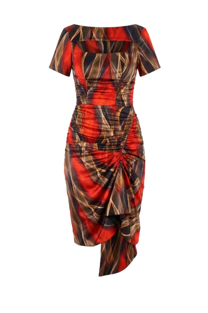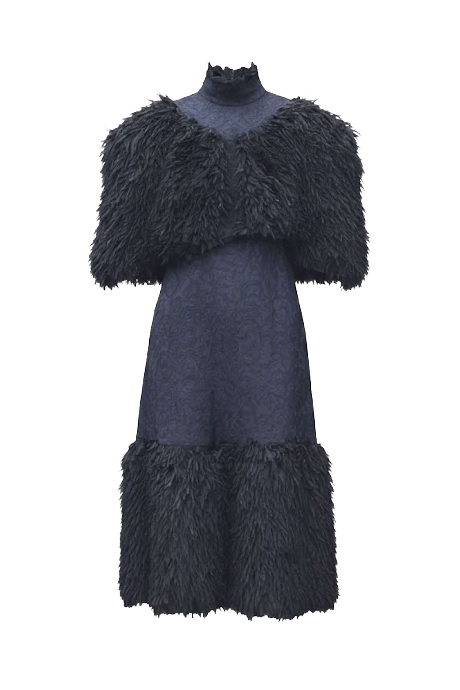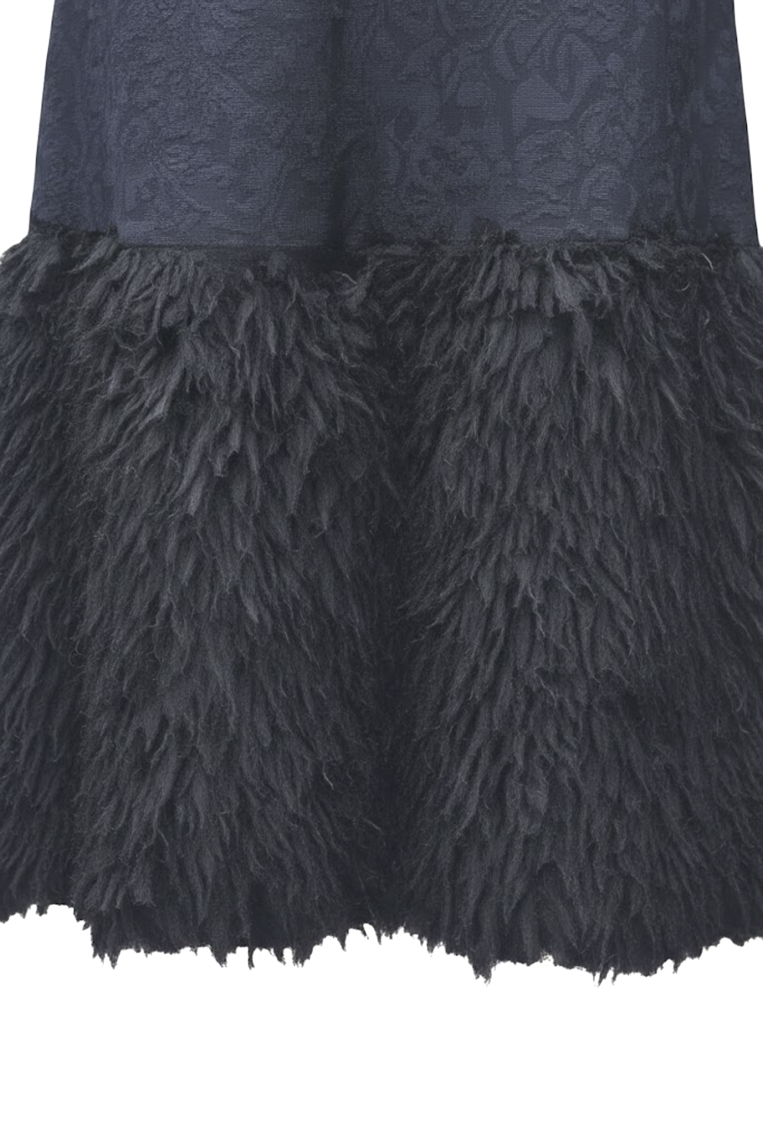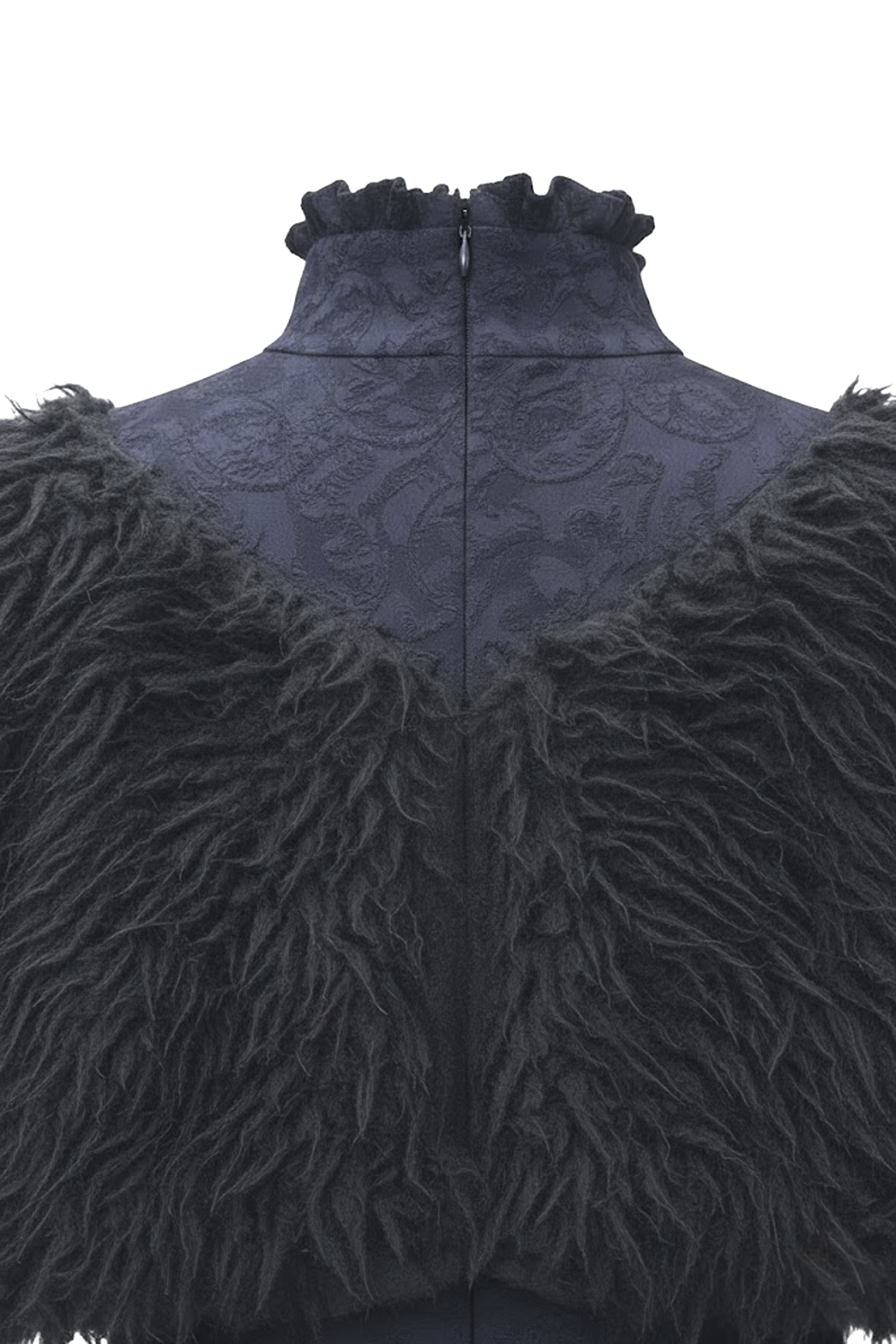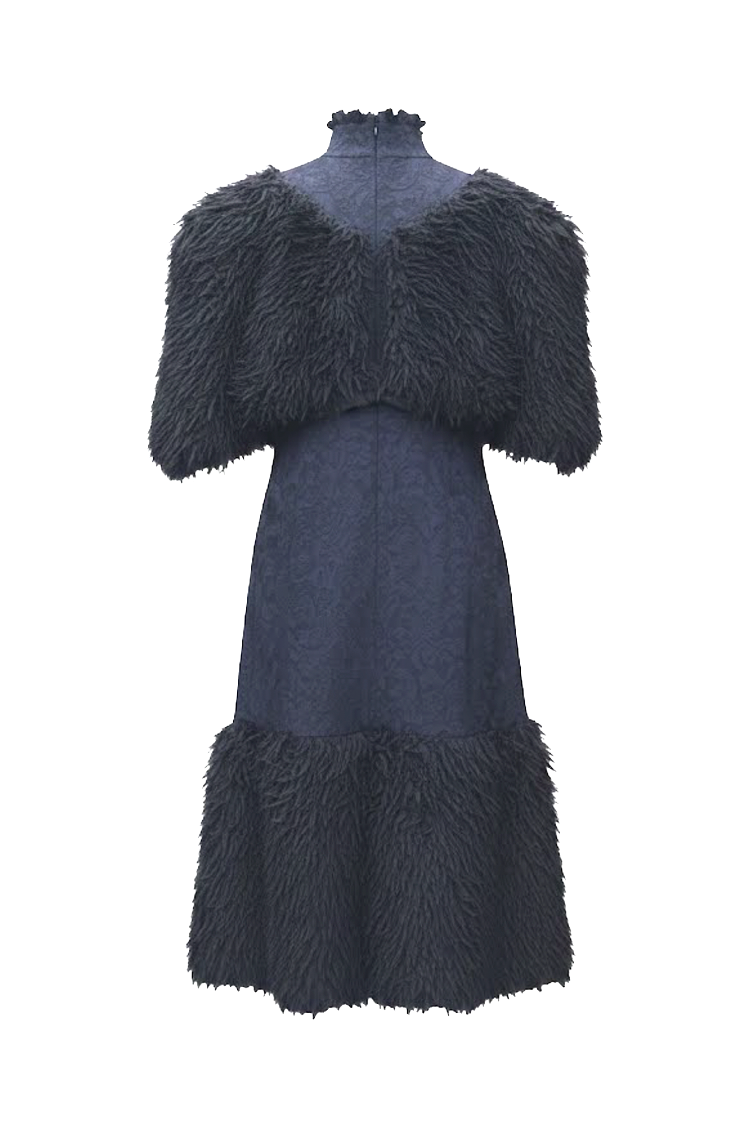 高腰剪裁:中段修身的緹花布料與上下兩端的毛絨形成視覺對比,極其顯腰細。