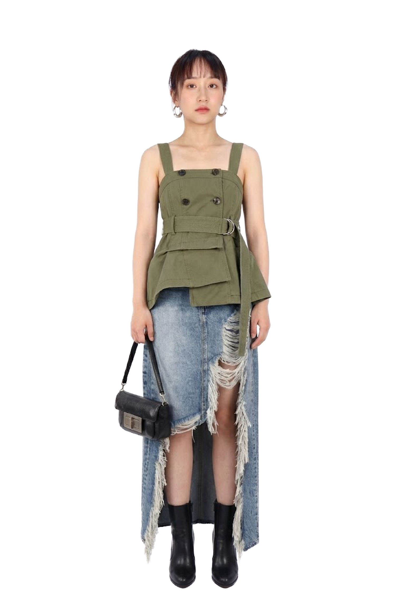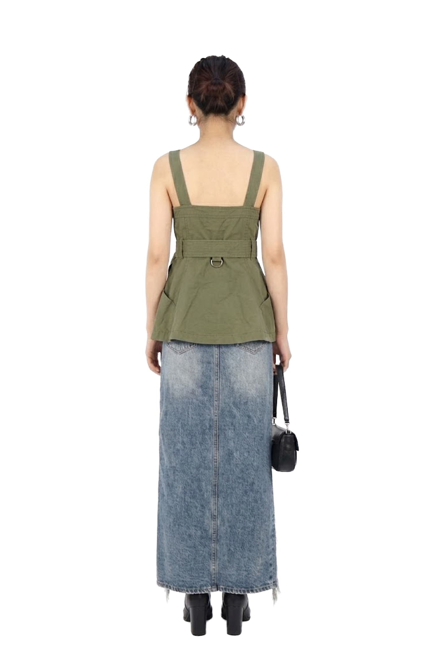面料:100% 斜紋棉 (Cotton Twill) ,布料紮實有挺度,能維持下襬的斜切弧度。