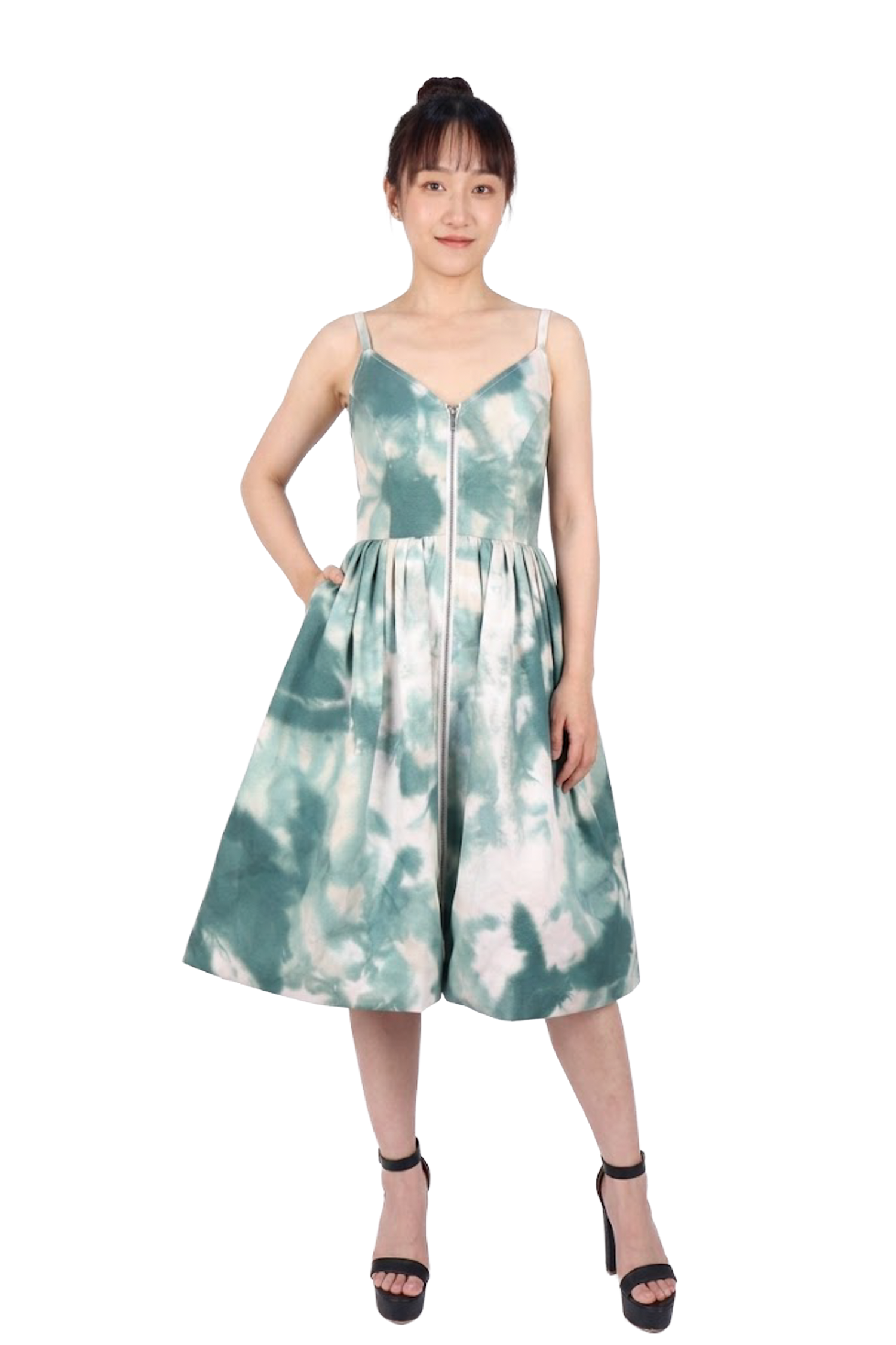 前中金屬拉鍊(可調整領口高低)、細肩帶設計、隱形側邊口袋。